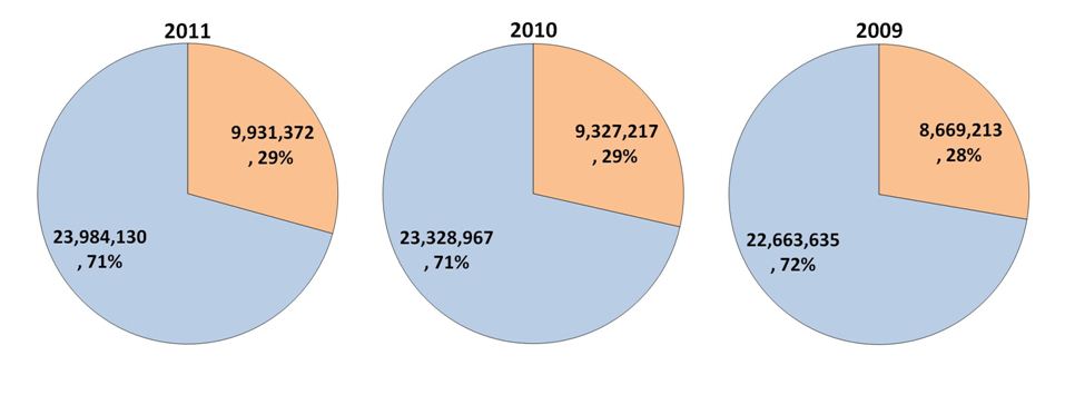 בדיקה של נתוני ההלמ"ס לשנים 2009-2011 מראה כי בממוצע המדינה אחראית לכ-29% מהכנסות בתקציב הרגיל של רשויות במעמד עיר, כ-9.9 מיליארד ש"ח בשנת 2011 מתוך סך הכנסות של 33.9 מיליארד ש"ח.