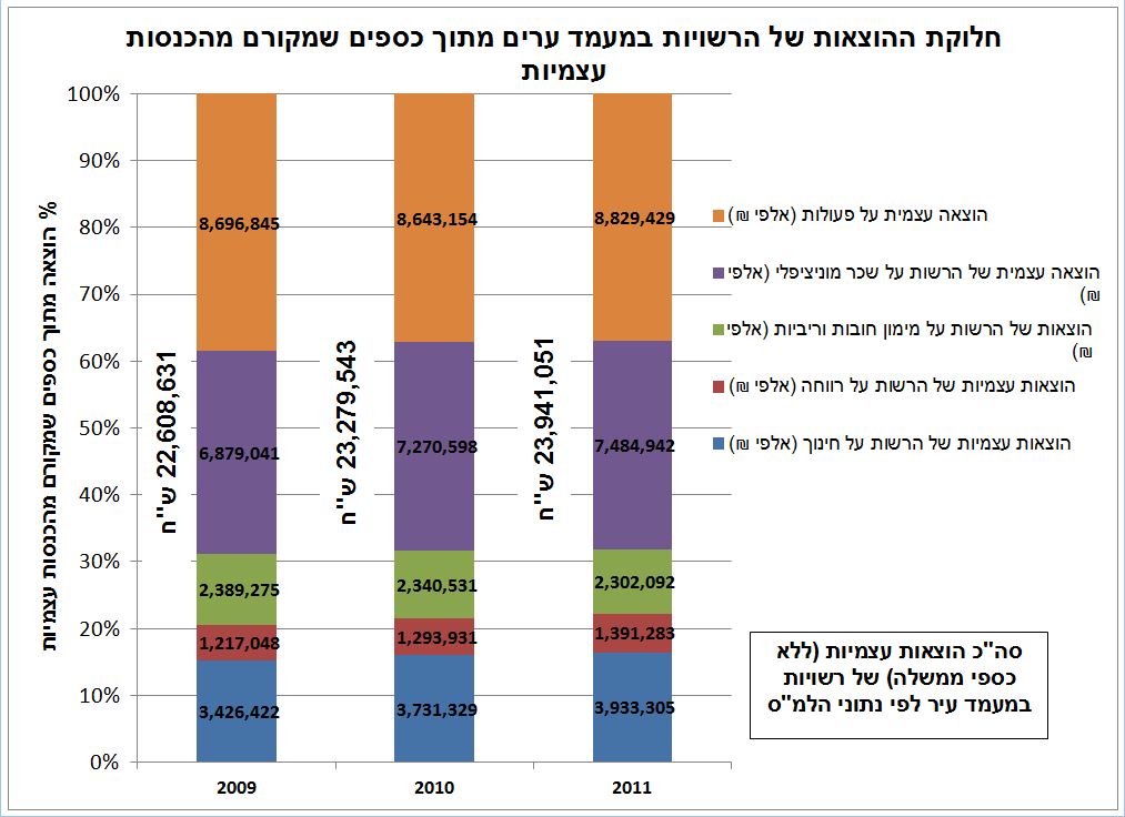 הוצאות בתקציב הרגיל של הרשויות מתוך הכנסותיהן העצמיות מתחלקות בכמעט ללא שינוי בין הסעיפים המרכזיים השונים (ראה גרף) ולכן ניתן לומר שכ-60% מכספי הרשות מופנים לטובת הוצאות שאינן הוצאות שכר או מימון באופן מובהק. סכום זה נע בין 13.5-14 מיליארד שקלים בשנה לעומת 8.7-9.9 מיליארד של הוצאות המבוססות על הכנסות מהמדינה.