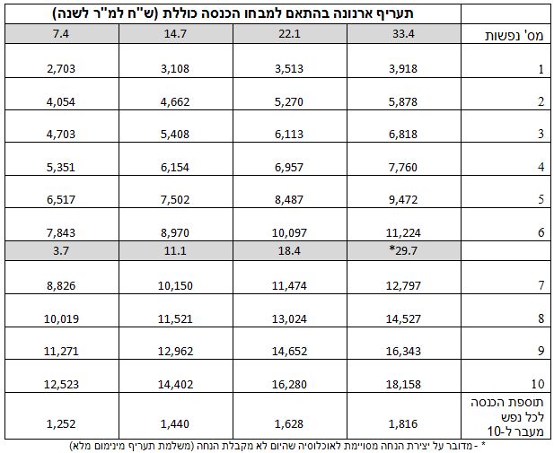 הדבר השלישי שגיליתי, תוך ביצוע מספר הנחות הגיוניות אך כאלה שדורשות הרבה נתונים לצורך הביסוס שלה, הוא שהיום רוב האוכלוסיות החלשות משלמות פחות או יותר את אותם תעריפי ארנונה (20-30 שקלים למקבלי הנחה של 40%) ולכן ניתן לבצע המרה של מנגנון ההנחות למנגנון של תעריפים קבועים לפי מבחן הכנסה. התוצאה של ניתוח הנתונים איפשרה לי להגדיר את טבלת מבחן ההכנסה מחדש: