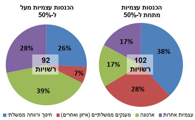 לעומת זאת בשאר 92 הרשויות כ-82% מהתקציב הממשלתי צבוע (חינוך ורווחה) והארנונה מהווה בממוצע כ-42% מהכנסותיהן. הרשויות הללו הן הרשויות שנמצאות בסיכון.