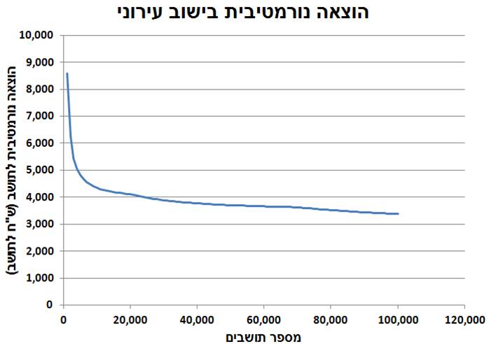 נוסחת ההוצאה הנורמטיבית הבסיסית לתושב נראית כמו גרף של פונקציה מעריכית יורדת[3]. הנוסחה מחלקת את הישובים העירונים לשלוש קבוצות – רשויות עד 20,000 תושבים, רשויות מעל 70,000 תושבים והישובים שהרשויות, כאשר לכל קבוצה יש מקדמים משלה לחישוב ההוצאה.