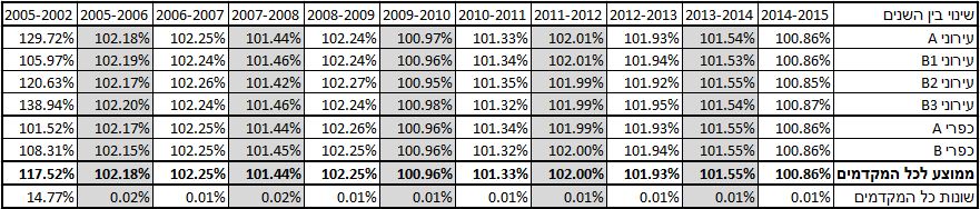 מסתבר שכל מקדמי הנוסחה מתעדכנים מדי שנה באופן אחיד! ללא קשר לעובדה שלא הצלחתי להבין את המנגנון, גודל העדכון השנתי ואיך הוא נקבע הוא פרט משני, זאת מכיוון שברור שהשינויים בהוצאות של הרשויות משנה לשנה לא יכולים להשתנות כולם באופן אחיד, הן ברמת קבוצת הגודל של הרשויות והן בסוג הרשות (ערים ומועצות מקומיות אל מול מועצות אזוריות). חדי העין ישימו לב שבין 2002 ל-2005 השינויים לא היו אחידים, זאת מכיוון שככל הנראה שב-2004 בוצע שינוי בשיטת החישוב – הנוסחה הבסיסית חושבה מחדש והחל מאותה שנה העדכון השתנה כך שאינו מבוסס על חישוב המקדמים כל שנה מחדש, אלא ע"י עדכונם לפי מקדם שמחושב כל שנה מחדש.