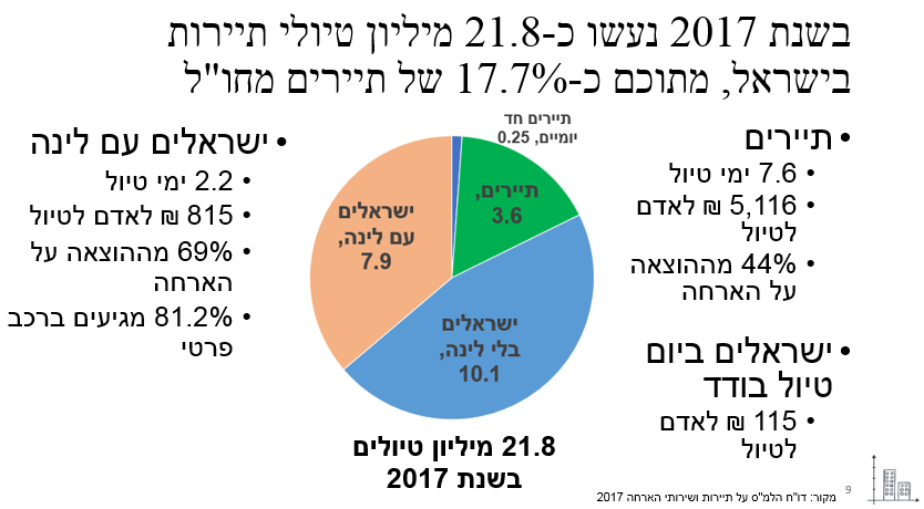 שנת 2017 הייתה שנת שיא לתיירות בישראל לאחר חמש שנים בהן הייתה סטגנציה במספר הלינות במלונות תיירות בישראל, עם 24.2 מיליון לינות במלונות תיירות (86% מכלל הלינות ב-2017) לעומת 22.2 מיליון לינות במלונות תיירות בשנת 2016, כאשר רוב הגידול נובע מתיירים ובעיקר בזכות הגידול בביקוש לשני יעדי התיירות המרכזיים בישראל – ירושלים ותל אביב – ביקוש אשר בא לידי ביטוי בגידול ממוצע תפוסת החדרים בערים אלה לעומת מ-60% בשנת 2016 ל-70% בשנת 2017. יחדיו ריכזו ירושלים ותל אביב כ-57.3% מכלל לינות התיירים בישראל וכ-77.1% מכלל הלינות בערים אלה.