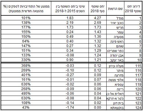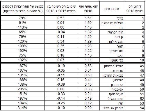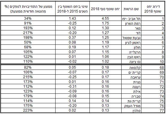 הטבלאות הבאות מרכזות את עשרת הרשויות בעלות היחס הגבוהה ביותר ועשרת הרשויות בעלות היחס הנמוך ביותר, בהתאם לסוג הרשות (ערים, מועצות מקומיות ומועצות אזוריות):