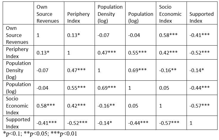 הבדיקה הראשונה שצריך לבצע בכל ניתוח סטטיסטי היא בדיקת קורלציה בין המשתנים הבלתי תלויים. הבדיקה הזאת אמרה משהו שכולם מכירים – מדד הפריפריאליות נמצא בקורלציה לא רעה (0.5~) עם גודל האוכלוסייה, המדד הסוציואקונומי, צפיפות האוכלוסייה והיותה של הרשות נתמכת. מקדמי הקורלציה מעידים שככל שרשות יותר פריפריאלית, כך המדד הסוציואקונומי שלה יורד, האוכלוסייה יותר קטנה ופחות צפופה וכן יש יותר סיכוי שהיא תהיה נתמכת – תוצאה אחת לאחת עם המציאות – ככל שמתרחקים מהמרכז, כך קטן מספר התושבים ברשויות, מבנה המגורים בהן פחות צפוף, תושביהן יותר עניים והרשויות יותר נתמכות. התוצאה הזאת מצביעה שייתכן וניתן לוותר על מדד הפריפריאליות בהמשך.