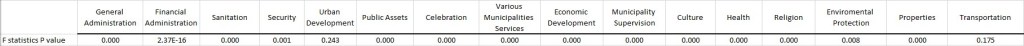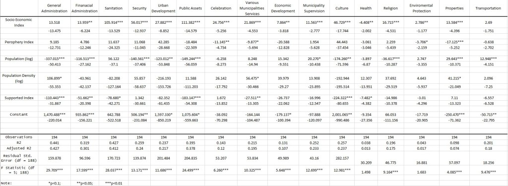 - ההוצאה לתושב על שירותי בריאות, נכסים, פיתוח כלכלי, חגיגות ואירועים (לא תרבות) ואיכות הסביבה ניתנת להסברה על ידי המדד הסוציואקונומי בלבד, אבל ערכו של R2 המתוקן מעיד שמדובר על השפעה מינורית.