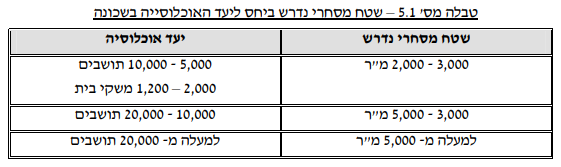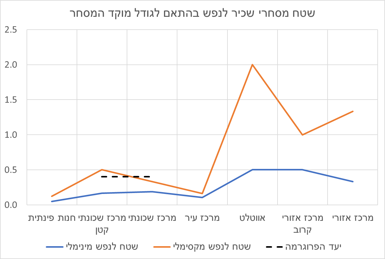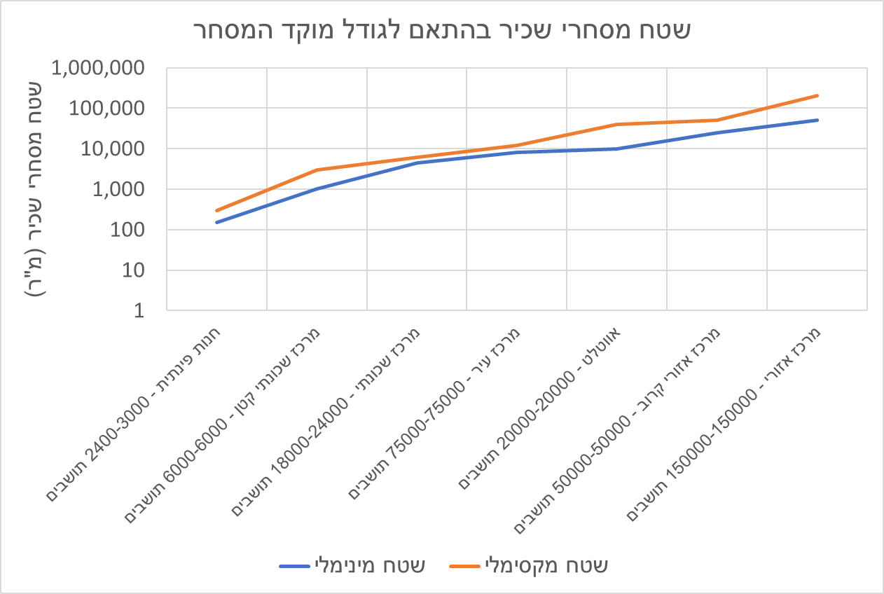 בשנת 2008 פרסם משרד השיכון והבינוי מדריך לתכנון, הקצאה ופריסה של שירותי מסחר בשכונות מגורים. במדריך הזה ניתנה התייחסות רחבה להיקפי המסחר הנדרשים בהתאם לגודל השכונה, לטיפוסים שונים של מוקדי מסחר וכן להיקף האוכלוסייה אשר "נדרשת" כדי לתמוך במסחר כך שיהיה בר קיימא. המדריך מגדיר כנקודת פתיחה ההקצאה הבסיסית של שטחי מסחר עומדת על 0.4 מ"ר שטח מסחרי לנפש (או חנות של 40 מ"ר ל-100 נפשות), זאת עבור מוקד מסחרי המשרת שכונה בצפיפות של 4 יח"ד לדונם ברוטו עם 3 נפשות למשק בית (12 נפשות לדונם או 8 דונם לחנות של 40 מ"ר; 12,000 נפשות לקמ"ר המקבלים שירות מ-8,000 מ"ר מסחרי לקמ"ר). אבל לא רק התושבים רלבנטיים להקצאה זו, המוקד המסחרי הזה צריך שהתושבים יהיו מעשירון ה-5 (של 2008), ברמת מינוע של 290 מכוניות ל-1000 נפשות (במונחי 2008, מדובר על רמת מינוע ברשויות עירוניות באשכול 6-9), במרחק של 30 ק"מ מהמטרופולין ובמרחק אפקטיבי של 5 ק"מ מהמע"ר הקיים. טבלה 5.1 במדריך מגדירה שטחים נדרשים בהתאם ליעדי האוכלוסייה: