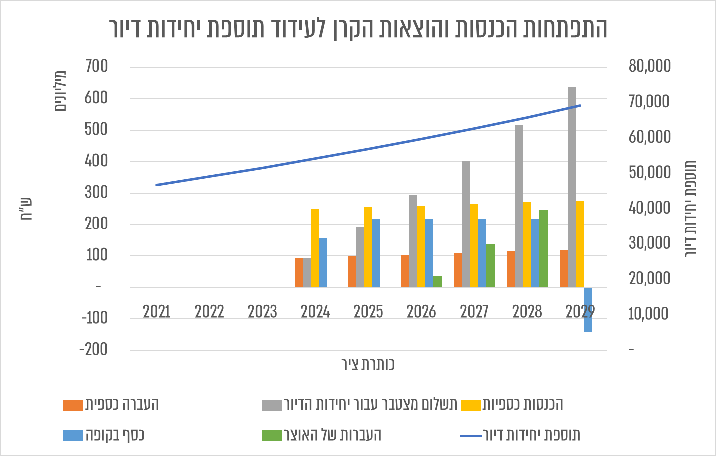 ראשית נתחיל מהנתונים. בשנת 2021 נבנו בישראל 46 אלף יחידות דיור. אם נבנה תרחיש שבו הקרן הזאת אכן מייצרת שינוי, נרצה שעד שנת 2029 הקרן תגדיל את המספר הזה ל-70 אלף יחידות דיור בשנה, שזה גידול של 5% בתפוקה השנתית כל שנה (שזה מספר סביר וראלי).