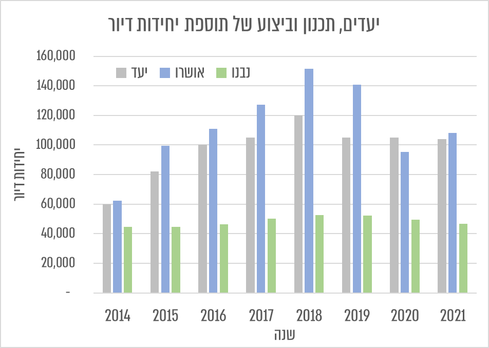 המשפט הזה הוא שקר גס. בין 2014 ל-2021 גדל המלאי התכנוני של המגורים ("היצע של תכנון למגורים") בכחצי מיליון יחידות דיור ביחס למלאי התכנוני שהיה ב-2014. הנה גרף שמבוסס על דיווחי מנהל התכנון ודיווחי למ"ס. הבעיה איננה היצע שטחי התכנון למגורים כי אם המימוש של התכנון הקיים – ולזה יש הרבה מאד חסמים אחרים