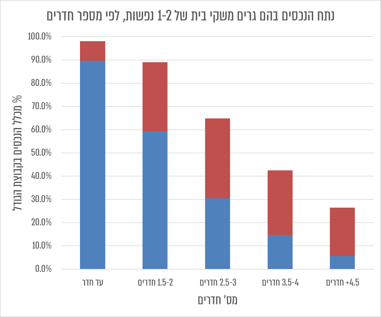 ניתן לראות כי הסבירות שמשק בית של 1-2 נפשות יגור בדירה עם מעט חדרים גבוהה מאד עד לנכסים של 2 חדרים וגם במקרה של נכסים של 2.5-3 חדרים רוב הדירות מוחזקות על ידי משקי בית קטנים, אם כי בדירות של 3 חדרים ויותר, יש היפוך וגם חלקם של משקי בית של נפש בודדת (בכחול) קטן מזה של 2 נפשות (באדום). הצד השני של המטבע הוא משקי בית עם יותר מ-2 נפשות: