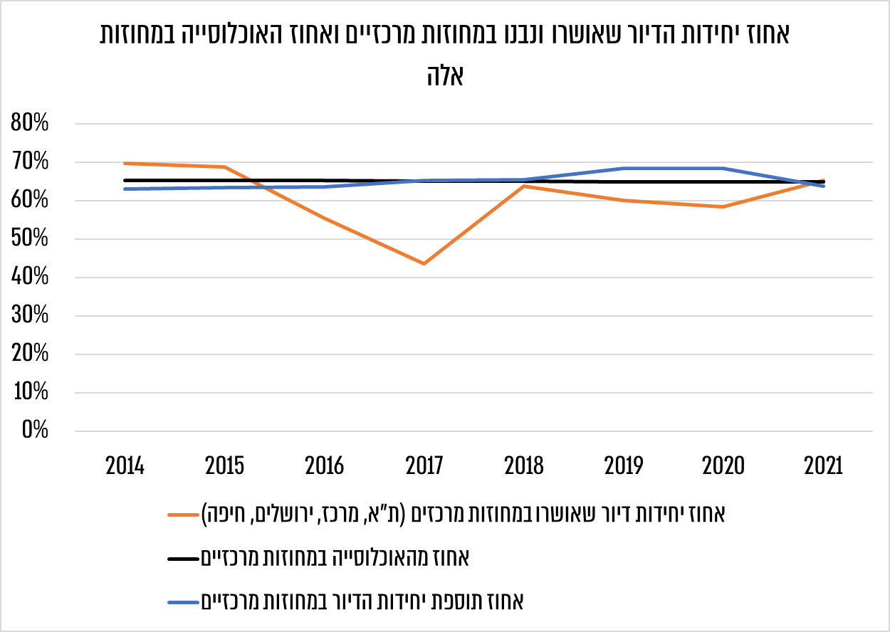 ראשית, קיים פער בין הביקוש להיצע באזורים מסוימים בישראל – אנשים רוצים לגור במרכז יותר מאשר שהם רוצים לגור בפריפריה, כפי שאפשר לראות בגרף הבא את השינויים במחוזות המרכזיים בישראל (ירושלים, ת"א, מרכז וחיפה). הגרף מראה את אחוז יחידות הדיור שאושרו בין 2014 ל-2021 במחוזות המרכזיים, את יחידות הדיור שנבנו באותם מחוזות ואת אחוז האוכלוסייה שחיה במחוזות אלה (כל המספרים הם מתוך 100% ארצי).