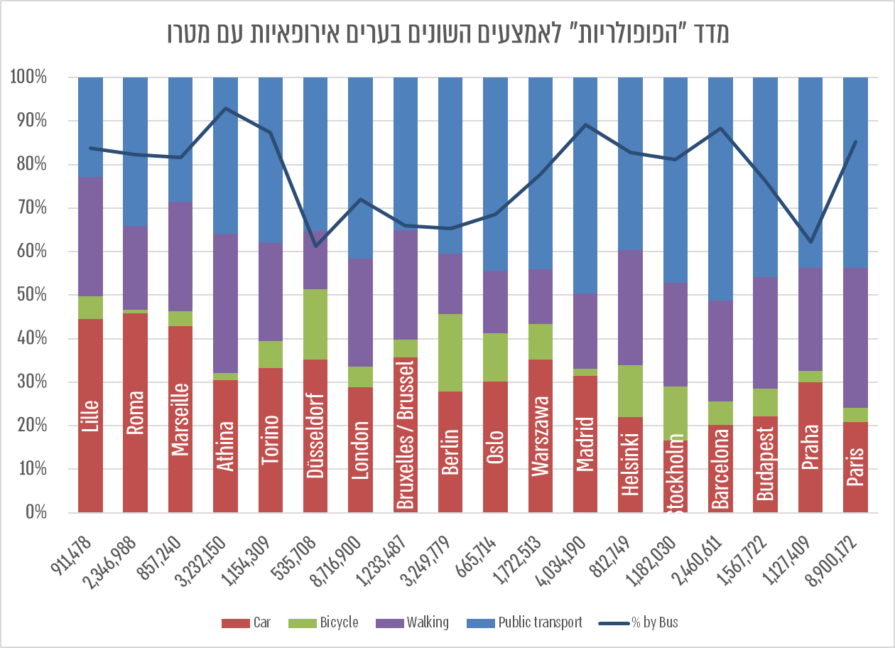 הגרף הזה מראה כי האוטובוסים כאן בכדי להישאר, עם או בלי מטרו, רוב הנסועה שנעשה (ביחס לגודל האוכלוסייה) תהיה באוטובוסים – כי זה האמצעי הגמיש שמייצר את הרשת הצפופה של התח"צ – ולכן המתנה למטרו שיפתור את כל הבעיות היא המתנה מיותרת – צריך לשפר את מערכת האוטובוסים היום.