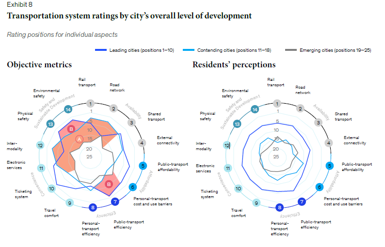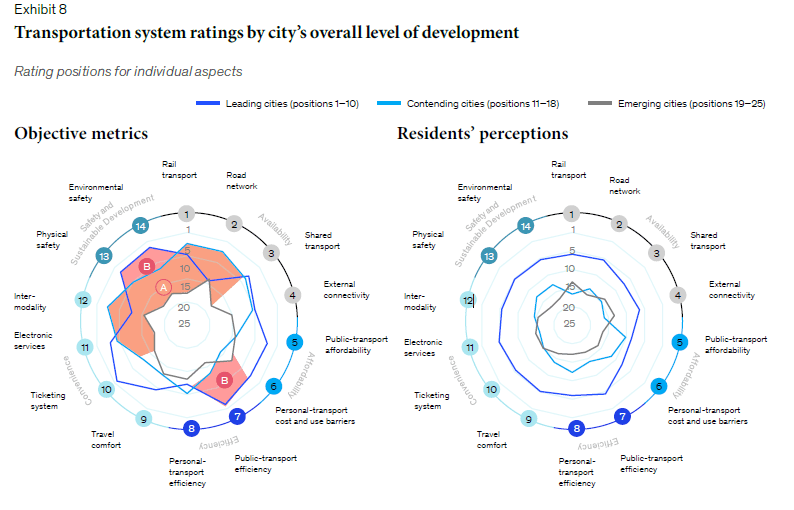 אמנם חלק מהמדדים גם מודדים היבטים של רכבים פרטיים, אבל מה שמעניין הוא השורה התחתונה – בעוד שלתושבים בערים המובילות רק תחבורה ציבורית יעילה יותר חשוב במעט משאר הפרמטרים (העיגול הימני, קו כחול כהה), הערים המובילות במדד (העיגול השמאלי, קו כחול כהה) רחוקות מלהיות הומוגניות – הערים האלה משקיעות בעיקר ביעילות התחבורה הציבורית והזמינות שלה, בנוחות של התחבורה הציבורית והבטיחות והשפעתה על הסביבה.