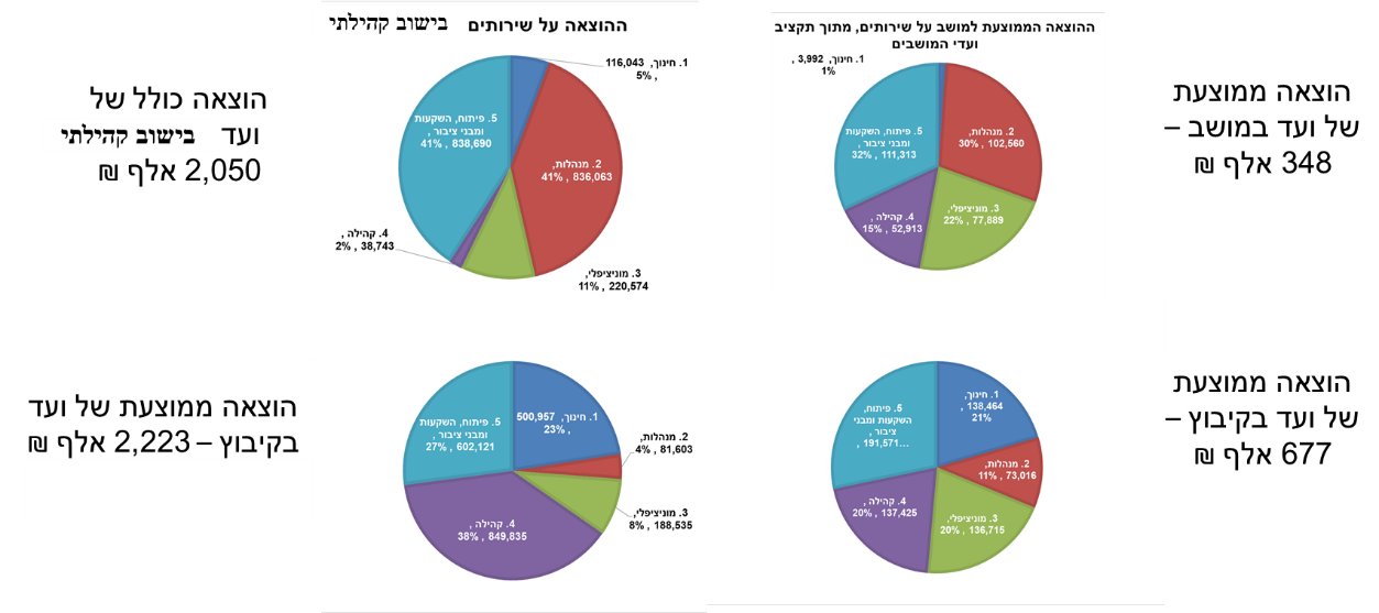 הגרפים הבאים מראים את עוגת התקציב של ישובים בהתאם למאפייני החוסן כלכלי שלהם וגודל הישוב. אפשר לראות שסכומי התקציב של הוועדים במושבים וגם בקיבוצים הפחות עשירים אינה גבוהה – באזור החצי מיליון ₪ בשנה – בישובים של כמה מאות תושבים. לעומתם, ישובים גדולים (קהילתיים) וקיבוצים גדולים בעלי אגודות שיתופיות חזקות ומעל אלף תושבים, התקציב גדול פי כמה ומגיע ל-2 מיליון שקלים. אפשר לראות שעוגת התקציב של הקיבוצים הגדולים מזכירה את העוגה של הקיבוצים הקטנים והעוגה של הישוב הקהילתי הגדול מזכירה את העוגה של המושבים הקטנים. ההבדל המרכזי בין הקיבוצים ושאר סוגי הישובים (במועצה הזאת) הוא שהקיבוצים מנהלים את גני הילדים ולכן חלקו של תקציב החינוך גדול בהם באופן משמעותי.