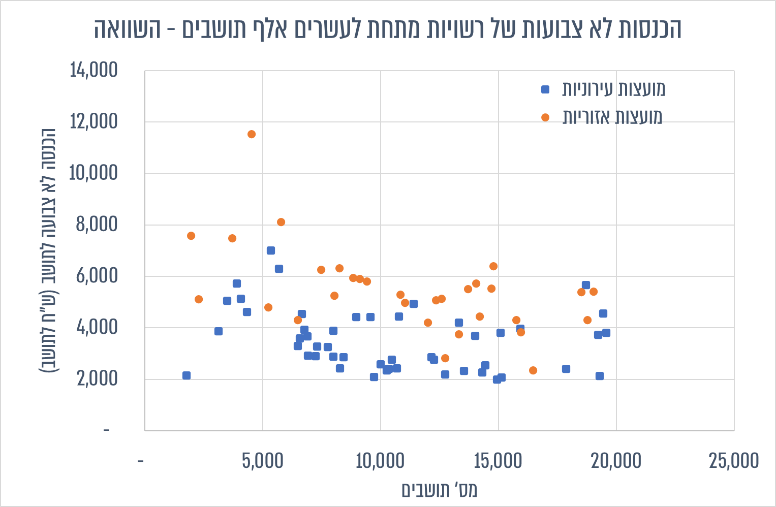 בישראל יש 201 רשויות עירוניות, כאשר כ-60 מהן קטנות מעשרת אלפי תושבים (30%). הישובים האלה לא יעילים כלכלית בהיבטים רבים, הראשון שבהם הוא חוסר היעילות בעלויות המנגנון המוניציפלי (בדיוק כמו מועצות אזוריות באותו סדר גודל). חוסר היעילות לגודל אל מול התקורות הקבועות לא משתנה בגלל שמדובר על מועצה מקומית או אזורית. אם זאת, ראוי לבחון את הפער בחוסר היעילות בהיבט הזה וכמובן, בהיבטים אחרים.