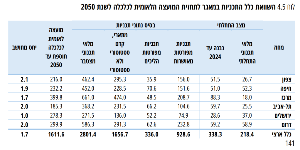 נתקדם עוד כמה שנים – המועצה הלאומית לכלכלה, אשר גיבשה את התחזית לדיור בשנת 2017 החלה לעדכן את התחזית, לשפר את המודל ובתחילת 2025 פרסמה את האסטרטגיה לדיור לשנת 2050. במסגרת האסטרטגיה גובשה תחזית מעודכנת לתוספת יחידות דיור לשנת 2050 וזו עמדה על תוספת של 1.745 מיליון יחידות דיור חדשות ביחס לשנת 2025 (69.8 אלף יח"ד בשנה) וזאת לפי תחזית האוכלוסייה הבינונית של הלמ"ס. אנשי המועצה עשו עוד כמה דברים בשונה מהתחזית הראשונה – הם בחנו מחדש את המודל תוך התייחסות למרכיבים כמו גודל משקי בית, חלוקה אזורית תוך התייחסות לביקושים אזוריים וכן התאמות נוספות כתוצאה מערים וישובים חדשים, כמו גם תוכניות דיור משמעותיות (תמ"א 75) שהממשלה החליטה שיש לקדמן. מי שרוצה לשמוע יותר על תהליך גיבוש התחזית מוזמן להאזין לראיון עם דוד בדל בפודקאסט של דורית גרפונקל.