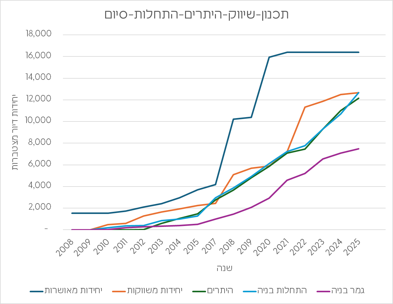 ניתן לראות כי בסוף 2025 יש פער של 5,200 יח"ד בין התחלות בניה וגמר בניה. על פי נתוני למ"ס לשנת 2025, יש בנתיבות 4,819 יח"ד בבניה פעילה – ולכן גם הפער הזה מוסבר. יש עוד 3,063 יחידות דיור מאושרות שטרם שווקו ובקצב שנתיבות עובדת, יציאה לשיווקים בשנתיים הקרובות תוביל לכך שהמלאי הזה יצא להיתרים תוך 3-4 שנים ויבנה תוך 7 שנים. על פניו, הטיעון של נתיבות מחזיק – יש לה ביקוש ולכן יש לה צורך בהגדלת המלאי המתוכנן במסגרת תמל 1124.